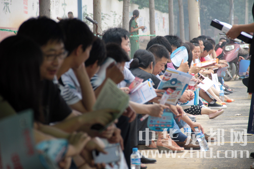 周口一高考點(diǎn)外陪考的家長(zhǎng)坐起“長(zhǎng)龍”。