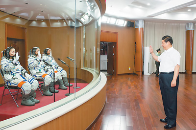 6月11日,中共中央總書記、國家主席、中央軍委主席習(xí)近平在酒泉衛(wèi)星發(fā)射中心觀看神舟十號載人飛船發(fā)射。這是習(xí)近平向即將出征的航天員聶海勝、張曉光、王亞平揮手致意。 新華社記者 李學(xué)仁攝 |