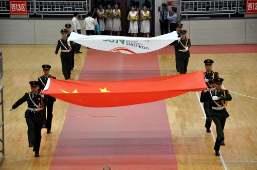 國旗、會旗方陣經(jīng)過主席臺。