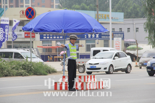 “天再熱,我們也要把交通指揮好?!?月22日12時30分,在中州大道寧洛高速路口附近,正在指揮交通的交警劉保兵對記者說。記者看到,汗水已經浸透了他的衣背,藍色的制服由淺變深。