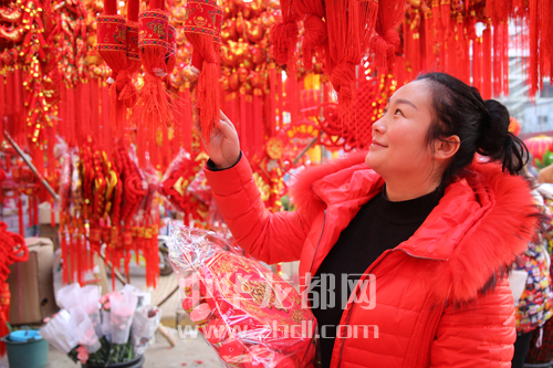 ????2月4日,在項城市水寨辦事處的一家商鋪前,市民正在挑選吊飾。新年臨近,當?shù)匕傩占娂姷绞袌錾线x購鮮切花、紅燈籠、中國結(jié)等節(jié)日飾品。 張永久 攝