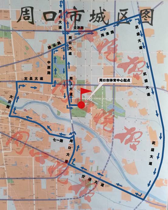 ????賽事初步確定報名參賽總人數(shù)為1萬人,其中,全程馬拉松2000人,半程馬拉松2000人,迷你馬拉松6000人。比賽路線(如圖)暫定為:市體育中心(起點)——周口大道——北高速口轉折——太清路——周淮路——武盛大道——周項路——周口大道——七一路——大慶路——文昌大道——中原路——建設路——周口大道——市體育中心(終點)。