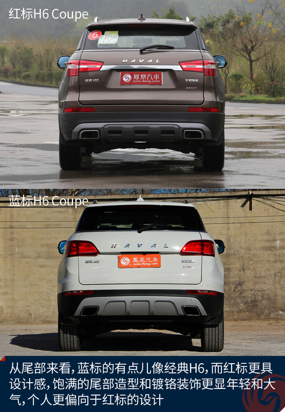 從車(chē)尾來(lái)看,個(gè)人認(rèn)為新款的紅標(biāo)好像比藍(lán)標(biāo)更加年輕,可能是設(shè)計(jì)年款導(dǎo)致的,新一些的設(shè)計(jì)更加年輕,當(dāng)然也不失沉穩(wěn),不過(guò)藍(lán)標(biāo)的H6 Coupe看起來(lái)確實(shí)更具個(gè)性。紅標(biāo)更符合大眾的審美。