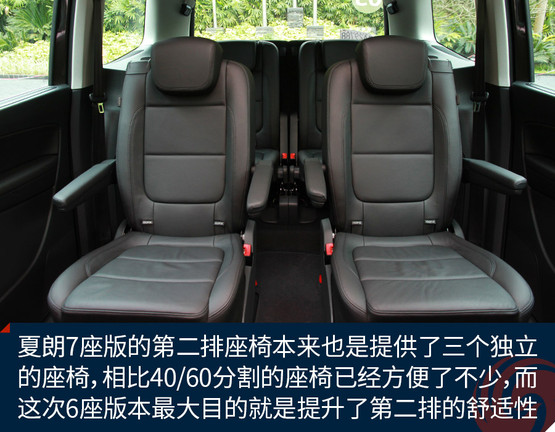 當然作為這次新增的車款,我們還是要重點介紹一下夏朗6座版相對于7座版的區(qū)別。首先要說明的是夏朗7座版的第二排座椅本來也是提供了三個獨立的座椅,相比40/60分割的座椅已經(jīng)方便了不少,而這次提供的6座版本最大目的就是提升了第二排乘客的舒適性。