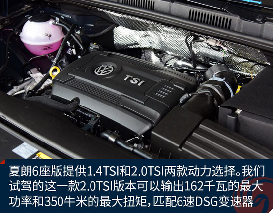 在動力方面,夏朗6座版也和7座版保持一致,提供1.4TSI和2.0TSI兩款動力選擇。我們試駕的這一款搭載第三代2.0T EA888發(fā)動機,可以輸出162千瓦的最大功率和350牛米的最大扭矩,并且匹配6速DSG雙離合變速器。