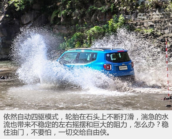 我從來也沒想過渡河是一件多么有樂趣的事兒,然而其實也挺危險的。水看著不是很深,但一下到水里就感覺坐進了船,漂在水上,湍急的水流沖的車身不斷輕微的搖擺,水中行車的阻力也很大,河底和河床上還遍布著大石頭,開著車就不斷的左左右右上上下下的顛簸著,不過只要穩(wěn)住油門,其實很輕松。后悔提前拆了頂棚,看著車身兩側濺起的水花,很爽,也很濕。