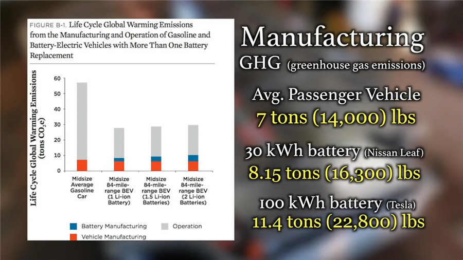 ????????無(wú)疑,電池比起傳統(tǒng)內(nèi)燃機(jī)排放的溫室氣體要多的多。普通的內(nèi)燃機(jī)乘用車在生產(chǎn)過(guò)程中會(huì)產(chǎn)生7噸的溫室氣體排放,而使用30千瓦時(shí)電池的日產(chǎn)聆風(fēng)會(huì)排放8.15噸溫室氣體。至于100千瓦時(shí)電池的特斯拉Model S P100D更是會(huì)產(chǎn)生11.4噸的溫室氣體。