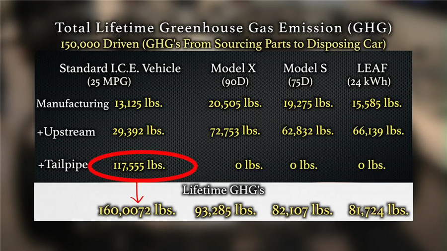????????這張表更加清晰,分別統(tǒng)計(jì)了普通內(nèi)燃機(jī)汽車(25MPG=百公里油耗9.4升)、特斯拉Model X 90D、Model S 75D和聆風(fēng)(電池容量24kWh)在車輛生產(chǎn),燃油/電能生產(chǎn)過(guò)程以及駕駛使用過(guò)程中的排放,可以看到,盡管電動(dòng)車在車輛生產(chǎn)、電能生產(chǎn)過(guò)程中產(chǎn)生的排放更高,但行駛工程中的零排放仍然使其在整個(gè)生命周期中的排放更低。