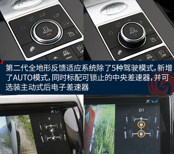 這套第二代全地形反饋適應(yīng)系統(tǒng),提供五種駕駛模式:普通駕駛模式、雪地模式、泥地模式、沙地模式以及攀巖模式。這些放在全新一代發(fā)現(xiàn)上似乎不值一提,不過(guò)第二代系統(tǒng)加入了AUTO模式,可自動(dòng)監(jiān)測(cè)行車狀況。同時(shí),第二代系統(tǒng)標(biāo)配可鎖止的中央差速器,并可選裝主動(dòng)式后電子差速器。