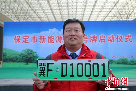 ????保定市民康辰龍領到該市第一副新能源汽車專用號牌?!∮诳×痢z