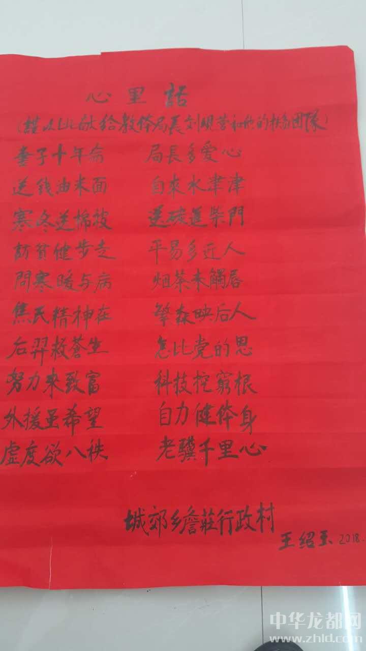 “我推敲了幾個(gè)半夜,寫(xiě)了《心里話——謹(jǐn)以此獻(xiàn)給教體局局長(zhǎng)劉現(xiàn)營(yíng)和他的扶貧團(tuán)隊(duì)》這首五言排律,表表我和老伴及全村對(duì)您的感激之情?!薄捌拮邮瓴?,局長(zhǎng)多愛(ài)心。送錢(qián)米油面,自來(lái)水津津。寒冬送棉被,送炭至柴門(mén)。訪貧健步走,平易又近人?!蓖踅B玉聲情并茂地朗讀著,劉局長(zhǎng)爽朗地笑了,“老伴劉桂蘭藥按時(shí)吃了嗎?”“按時(shí)吃了,多虧您,到我家宣講扶貧政策,幫助我聯(lián)系有關(guān)單位,我老伴享受了慢性病醫(yī)保。”“桂蘭說(shuō),人家劉局長(zhǎng)隔三差五給咱送米面油,逢年過(guò)節(jié)給咱送慰問(wèn)金,前幾天頂風(fēng)冒雪送來(lái)兩床被子,一年不知來(lái)了多少趟,待咱比親人還親??!我家也沒(méi)有什么拿出手的,我倆一合計(jì),就發(fā)揮我的一點(diǎn)專長(zhǎng),給您寫(xiě)了首詩(shī),您經(jīng)常去我家噓寒問(wèn)暖,我今個(gè)也來(lái)您這,算是走走親戚吧,回報(bào)回報(bào)您!”