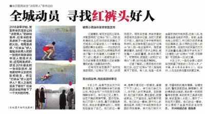 1月3日,中央電視臺(tái)新聞?lì)l道《新聞直播間》欄目報(bào)道此事。一時(shí)間,“紅褲頭”救人的事跡,在金昌市乃至整個(gè)甘肅省引起了強(qiáng)烈的反響。在官方微信平臺(tái)上,有上百條留言,大多是為“紅褲頭”小哥點(diǎn)贊的。不少人希望找到這個(gè)不愿留名的英雄。為此,《金昌日?qǐng)?bào)》以及當(dāng)?shù)孛襟w紛紛發(fā)起“尋找紅褲頭好人”“尋找冰窟救人的無(wú)名英雄”的尋人啟事。