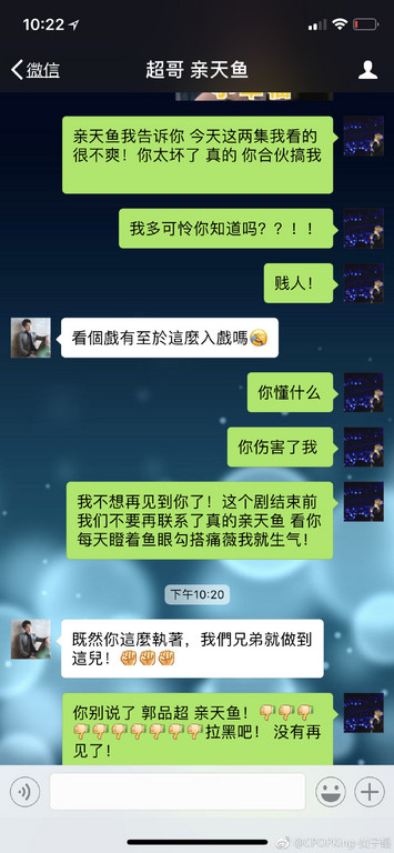 黃子韜12日在微博上分享一張與郭品超的對(duì)話截圖,并在發(fā)文中生氣地寫(xiě)道:“什么都不用說(shuō)了!拉黑吧!”他似乎是在看了最新播出的2集《談判官》后,為自己劇中的遭遇感到憤憤不平,立刻找郭品超算賬直呼:“親天魚(yú)(秦天宇,郭品超劇中角色)我告訴你,今天這兩集我看的很不爽!你太壞了,真的,你合伙搞我。我多可憐你知道嗎?!賤人!”