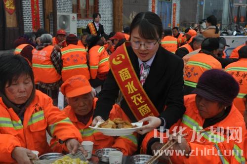 春節(jié)以來,城區(qū)人口增加,環(huán)衛(wèi)工人工作量大增,許多工人吃不上應(yīng)時(shí)熱飯。為感謝環(huán)衛(wèi)工人的辛苦工作,愛心企業(yè)商水農(nóng)商行精心為當(dāng)日值班的環(huán)衛(wèi)工作提供了免費(fèi)午餐,并為每位環(huán)衛(wèi)工作提供了一份精美禮品?!吧显耍 辈穗壬蠅蚴畟€(gè),農(nóng)商行工作人員端上來大盆元宵?!袄哿艘簧衔?,能在這和大家一道過元宵佳節(jié),真是太感謝農(nóng)商行的領(lǐng)導(dǎo)!”65歲的環(huán)衛(wèi)工人趙明亮吃著甜滋滋的元宵高興地說。