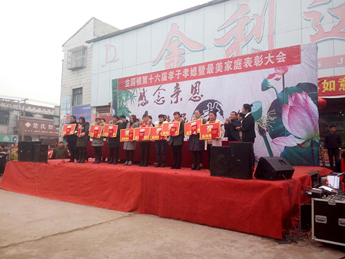 歡快的音樂聲中,胸戴大紅花的96名“孝子孝媳”和20個“最美家庭”代表依次上臺,領(lǐng)取榮譽(yù)證書和獎品。