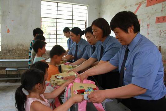 該院2013年成立了“檢察官媽媽”愛心服務(wù)隊(duì),與貧困家庭結(jié)成對(duì)子,一對(duì)一的幫扶,為貧困的留守兒童解決生活、學(xué)習(xí)上的實(shí)際困難。每年的“六 一”兒童節(jié)、中秋節(jié)、春節(jié)期間慰問貧困兒童,給他們帶去學(xué)習(xí)用具、衣物為他們表演自編自演的節(jié)目。女檢察官們用女性特有的細(xì)心、耐心和愛心,不但在物質(zhì)上給予幫助,在心靈上給予關(guān)懷,讓他們?cè)陉柟庀陆】悼鞓返某砷L。