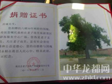 上午9時,張麗娟在儀式上向房墉先生頒發(fā)了捐贈證書,并在儀式結(jié)束后共同栽植下6棵30年樹齡捐贈國槐樹。據(jù)了解,這是北京翰高集團繼打造沈丘中華槐園、捐栽槐樹添綠淮陽伏羲陵園后,今年又先后為老子故里鹿邑以及周口中心城區(qū)捐栽價值100多萬元的國槐樹。