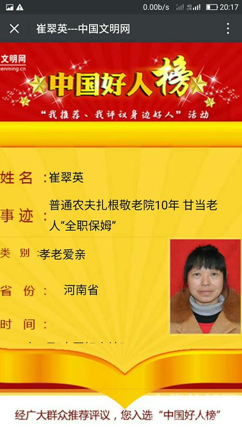 中華龍都網(wǎng)訊(周口報(bào)業(yè)全媒體記者馬治衛(wèi))3月30日晚,中國(guó)文明網(wǎng)發(fā)布消息:太康縣朱口官路沿村村民、太康縣朱口鎮(zhèn)敬老院院長(zhǎng)助理崔翠英入選中國(guó)好人榜。