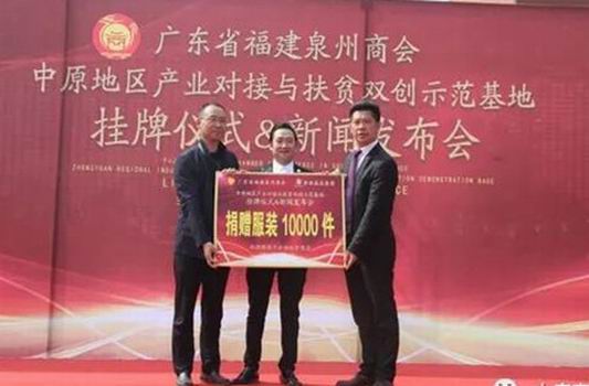 儀式上,廣東省福建泉州商會(huì)與香港磊磊集團(tuán)捐贈(zèng)服裝10000件,用于啟動(dòng)扶貧商店。與會(huì)領(lǐng)導(dǎo)共同為“廣東省福建泉州商會(huì)中原地區(qū)產(chǎn)業(yè)對(duì)接與扶貧雙創(chuàng)示范基地”揭牌。隨后,與會(huì)人員共同到潤(rùn)泰紡織、盛宏紡織、萬(wàn)利源棉業(yè)等企業(yè)進(jìn)行了參觀,并召開(kāi)了廣東省福建泉州商會(huì)中原地區(qū)產(chǎn)業(yè)對(duì)接與扶貧雙創(chuàng)示范基地產(chǎn)業(yè)對(duì)接論證座談會(huì)。