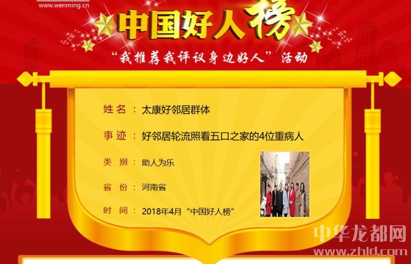 中華龍都網(wǎng)訊(周口報(bào)業(yè)全媒體記者 馬治衛(wèi))4月28日上午,4月中國好人榜發(fā)布儀式暨全國道德模范與身邊好人現(xiàn)場交流活動在天津市和平區(qū)舉行。太康縣“好鄰居群體”榮登4月份中國好人榜。