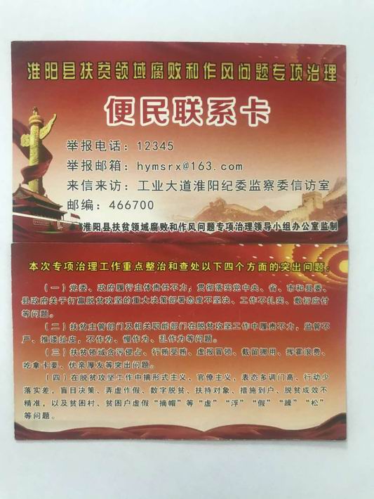 今年4月,淮陽縣扶貧領(lǐng)域腐敗和作風問題專項治理全面啟動。為確保專項治理取得實效,縣紀委監(jiān)委印制發(fā)放“便民聯(lián)系卡”,進一步加大宣傳力度,暢通信訪舉報渠道。他們統(tǒng)一制作的扶貧領(lǐng)域腐敗和作風問題專項治理便民聯(lián)系卡,上面印有專項治理工作重點整治和查處的4個方面內(nèi)容。具體包括黨委、政府履行主體責任不力,脫貧攻堅工作不扎實,敷衍應(yīng)付;扶貧部門及相關(guān)職能部門脫貧攻堅工作中不作為、慢作為、亂作為等;扶貧領(lǐng)域發(fā)生貪污侵占,虛報冒領(lǐng),截留挪用等問題。聯(lián)系卡公布了舉報電話和來信來訪地址,方便群眾對黨員干部和部門的監(jiān)督。