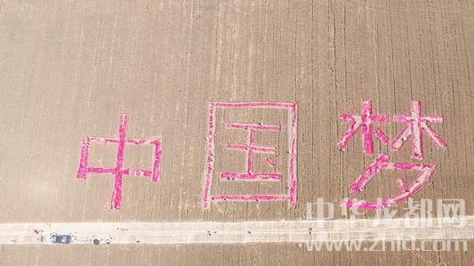 記者在現(xiàn)場看到,“中國夢”三個(gè)字每個(gè)字高約30米,寬約23米,間隔約10米,筆畫寬約2米。為了讓字跡突出,他們把以前懸掛宣傳標(biāo)語的廢棄紅布條,鋪在麥茬上。一片金黃中,紅艷的字體格外奪目。
