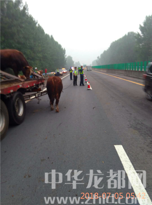 中華龍都網(wǎng)訊(周口報業(yè)全媒體記者 姬慧洋 通訊員 劉杰 文/圖)“在大廣高速2025公里西半幅附近發(fā)生一起單方事故,幾十頭牛散落在路面,請求處警?!?月5日5時許,周口市公安局交通管理支隊高速二大隊扶溝中隊接到110指令稱。