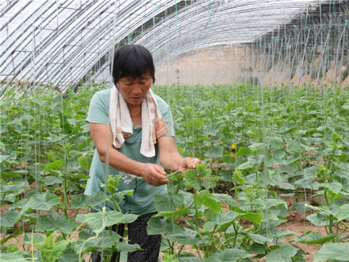 近年來,沈丘縣周營(yíng)鎮(zhèn)大力發(fā)展藥材種植和特色瓜果蔬菜種植,既解決了貧困戶的就業(yè)問題,又促進(jìn)了當(dāng)?shù)剞r(nóng)業(yè)生產(chǎn)。圖為7月24日,貧困群眾孫素英在蔬菜種植基地管理吊籐晚秋小黃瓜。 記者 韋偉 通訊員 謝辛凌 攝