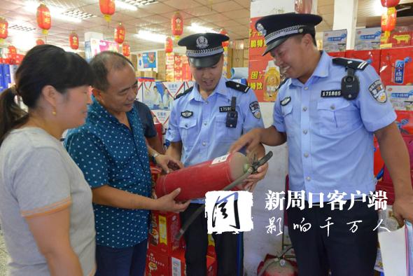 針對(duì)高溫天氣火災(zāi)易發(fā)實(shí)際,扶溝縣公安局呂潭派出所深入開(kāi)展火災(zāi)隱患排查整治、消防宣傳教育培訓(xùn),從源頭上消除火災(zāi)隱患。圖為8月13日,民警正在檢查超市消防設(shè)施,講解消防常識(shí)。