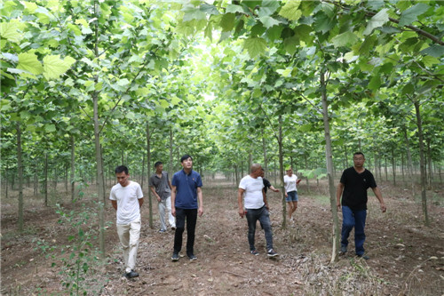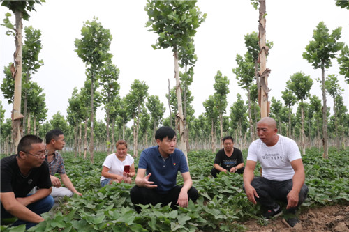 與前廟相鄰的大張村,是一個“天然大氧吧”。從大張村走出來的曹紅星在鄭州從事園林綠化多年,在朱口鎮(zhèn)黨委、鎮(zhèn)政府的支持和鼓勵下,他以1000元/畝的價格流轉(zhuǎn)了1000多畝土地,種植法桐、欒樹、國槐等綠化樹。有著豐富經(jīng)驗的曹紅星在種植綠化樹的同時,積極發(fā)展林下經(jīng)濟(jì),在綠化樹下種植紅薯、大蒜等,有效提高了土地的利用率,經(jīng)濟(jì)效益顯著提高?!捌綍r,綠化林地除草、抗旱、施肥需要用工,收種紅薯、大蒜等也需要用工,用工時貧困戶優(yōu)先。只要有勞動能力,來這里就能掙錢?!辈芗t星說,林業(yè)經(jīng)濟(jì)的快速發(fā)展為鄉(xiāng)親們脫貧致富提供了保障。