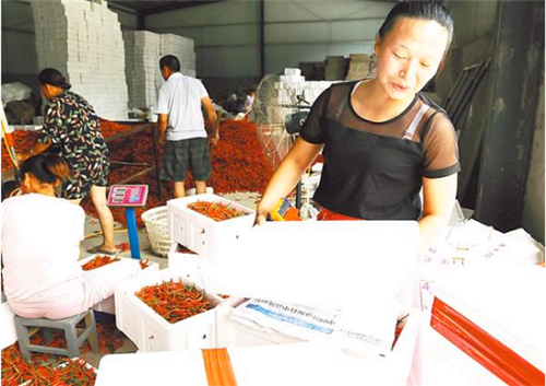 該鎮(zhèn)采取統(tǒng)一包裝、統(tǒng)一品牌、統(tǒng)一儲存、統(tǒng)一銷售經(jīng)營銷售模式,吸引大批外地商戶上門收購辣椒。