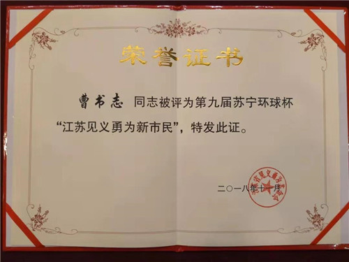 11月14日,江蘇省見義勇為基金會第九屆蘇寧環(huán)球杯“江蘇見義勇為新市民”頒獎典禮在南京舉行,來自河南省項城市新橋鎮(zhèn)的農(nóng)民工曹書志獲此殊榮。
