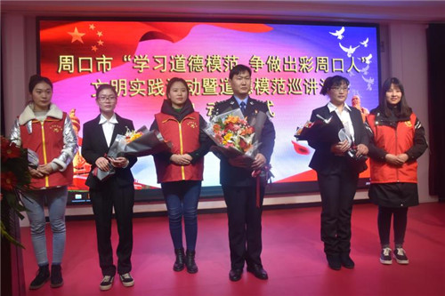 市公安局交警王凱偉是2018年敬業(yè)奉獻(xiàn)類(lèi)中國(guó)好人,省五四獎(jiǎng)?wù)芦@得者,經(jīng)常參加公益活動(dòng),持續(xù)幫助貧困女孩小夢(mèng)麗和她家人,用善舉挽救了這個(gè)貧困家庭。扶溝縣曹里鄉(xiāng)刁灣小學(xué)教師李艷琴扎根鄉(xiāng)村教育一線(xiàn)無(wú)怨無(wú)悔,數(shù)年如一日照顧癱瘓?jiān)诖驳钠牌湃蝿谌卧?,曾獲縣最美鄉(xiāng)村老師稱(chēng)號(hào)。鹿邑伯陽(yáng)中學(xué)“90后”女教師劉交交剛參加完高考后父親因病去世,母親身患?xì)埣?。她不向命運(yùn)低頭,靠打工收入和微薄的助學(xué)金維持生活和學(xué)業(yè),為照顧母親,她攜母上大學(xué),曾獲中國(guó)大學(xué)生自強(qiáng)之星等稱(chēng)號(hào),被授予省五四獎(jiǎng)?wù)?。三位道德模范雖然都是最平凡的人,但都有一顆不平凡的心,他們的感人事跡散發(fā)著奪目的光芒,深深感染了現(xiàn)場(chǎng)的每一位聽(tīng)眾,不少人流下了感動(dòng)的淚水。