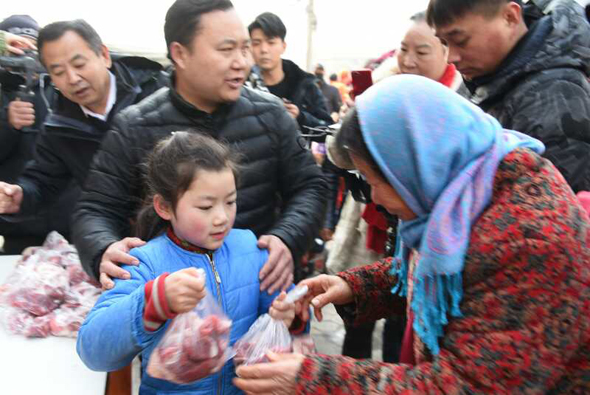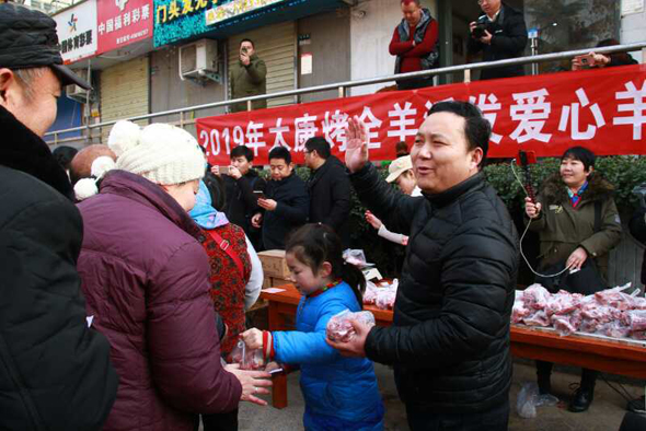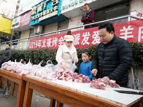 小小燒烤店門前,成了倡導(dǎo)“愛與奉獻(xiàn)主會(huì)場”。 2019年1月1日上午10點(diǎn),新年第一天,鄭州市國基路與豐慶路交叉口太康烤全羊店門口,60多名環(huán)衛(wèi)工、殘疾人、困難群眾等弱勢(shì)群體聚集在這里,排隊(duì)免費(fèi)領(lǐng)取“羊肉哥”孫合理和妻子劉曉愛派送的一份新年禮物——愛心羊肉,而這愛舉從2010年元旦開始到如今,已經(jīng)堅(jiān)持了9年。