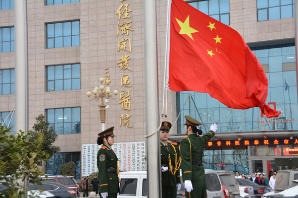 2月10日,正月初六,年后開工的好日子。在嚴(yán)格的“禁放令”下,周口城區(qū)沒有了“開門炮”的喧囂,卻有著更有意義的慶祝方式。圖為周口協(xié)和骨科醫(yī)院隆重舉行升國(guó)旗儀式,全面啟動(dòng)節(jié)后工作,并祝愿祖國(guó)新年好運(yùn)。 記者 李偉 攝