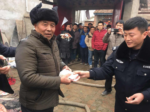 2月17日下午3時(shí)許,鄲城縣南豐鎮(zhèn)徐寨行政村徐大莊一村民使用地鍋后忘記滅火發(fā)生火災(zāi),鄲城縣公安局一村一警張振偉冒險(xiǎn)進(jìn)入火中,幫助轉(zhuǎn)移出1萬(wàn)元現(xiàn)金和重要證件。