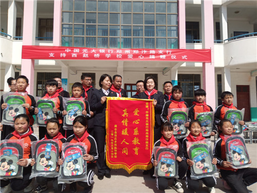 捐贈儀式上,鄭汴路支行行長苗長海一行向趙橋?qū)W校捐贈文具袋50只、書包50個、跳繩50根、板球拍50對、熱水袋50只、圍巾50只、跳棋50盒、沙包200個。苗長海表示,光大銀行鄭州鄭汴路支行會一如既往的積極響應黨中央脫貧攻堅的重大部署,與省、市、縣、鄉(xiāng)結(jié)合繼續(xù)開展形式多樣的愛心扶貧等公益活動。他希望趙橋?qū)W校要運用好捐贈的學習、生活、體育用品,同時勉勵孩子們一定要好好學習、將來回報社會各界的關(guān)愛和支持。