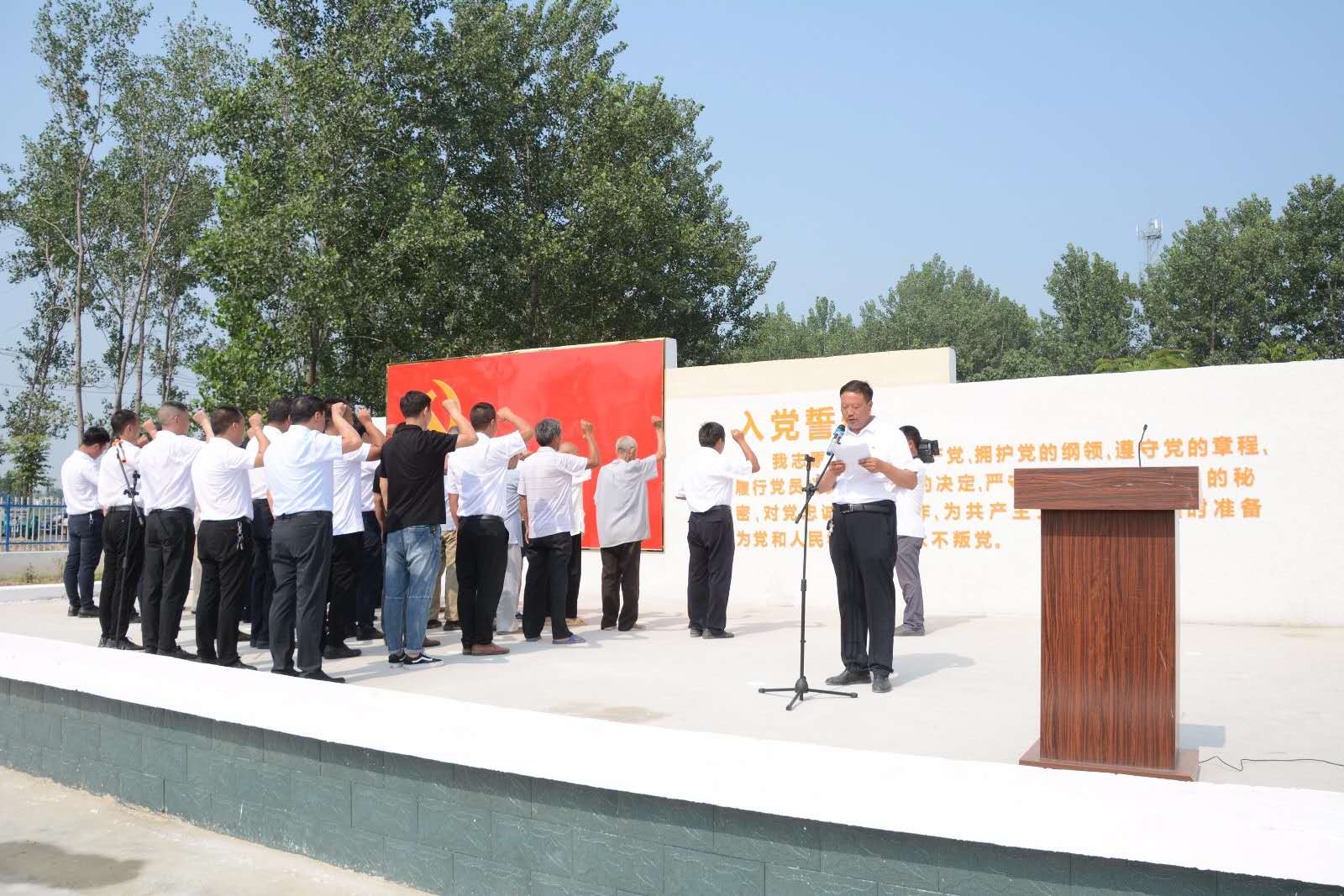 “我志愿加入中國共產(chǎn)黨,擁護(hù)黨的綱領(lǐng),遵守黨的章程……”升國旗儀式結(jié)束后,由紀(jì)莊支部書記李國喜領(lǐng)誓,全體黨員面對(duì)鮮紅黨旗,胸前佩戴黨徽,排著整齊的隊(duì)列,高高舉起右手,再次向黨作出了莊嚴(yán)地承諾,重溫入黨誓言,聲聲入耳,句句入心。