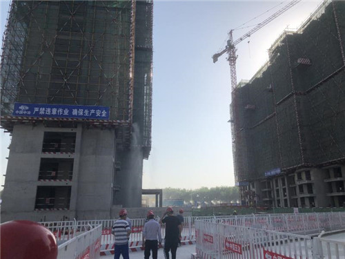當(dāng)日下午,記者在金海嘉苑3標(biāo)段施工現(xiàn)場看到,高聳入云的塔吊有條不紊地作業(yè),施工車輛不時進(jìn)出,施工人員揮汗如雨緊張施工,一派忙碌的施工景象。工地環(huán)保措施也相當(dāng)?shù)轿唬瑯菍訃娏芗て鹚F彩虹,圍擋及通道噴淋霧狀灑水,車輛進(jìn)出必須清洗。在項(xiàng)目入口施工顯示牌上,噪音、揚(yáng)塵等指標(biāo)均嚴(yán)格控制在標(biāo)準(zhǔn)區(qū)間內(nèi)。