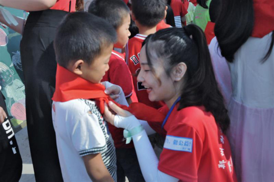 開班儀式上,鄭州升達(dá)經(jīng)貿(mào)管理學(xué)院的支教老師為同學(xué)們佩戴了紅領(lǐng)巾,伴隨著國歌進(jìn)行了升國旗教育,支教老師進(jìn)行集體宣誓。支教老師代表作表態(tài)發(fā)言時說:“很高興能夠來鹿邑周樓小學(xué)支教,作為一名當(dāng)代青年大學(xué)生,我們能夠擔(dān)當(dāng)重任,吃苦耐勞,全身心地完成兩周的支教活動,與孩子們快樂相處?!?/p>