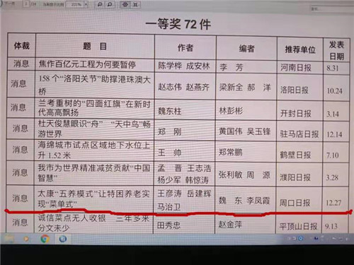 據(jù)介紹,本屆河南新聞獎(jiǎng)獲獎(jiǎng)作品具有“把握時(shí)代脈搏 謳歌時(shí)代精神”“反映重大主題 積極服務(wù)大局”“講述中國(guó)故事 彰顯主流價(jià)值”等特點(diǎn),主題深刻、事實(shí)準(zhǔn)確、文風(fēng)生動(dòng)、表現(xiàn)新穎,充分反映我省新聞戰(zhàn)線積極宣傳報(bào)道黨的十八大以來(lái)我省發(fā)展的歷史成就、歷史變革,報(bào)道我省各行各業(yè)改革開放的豐碩成果和感人事跡,特別是聚焦打贏精準(zhǔn)扶貧攻堅(jiān)戰(zhàn),形成宣傳的強(qiáng)大聲勢(shì)。作品堅(jiān)持正確的輿論導(dǎo)向、唱響主旋律、大力宣傳社會(huì)主義核心價(jià)值觀,為新時(shí)代中原更加出彩提供強(qiáng)有力的輿論支撐和良好的輿論氛圍?!短怠拔屦B(yǎng)模式”讓特困養(yǎng)老實(shí)現(xiàn)“菜單式”》具有“重大題材”“重大影響”“重大意義”等特點(diǎn),經(jīng)過(guò)專家層層評(píng)審,最終在眾多參評(píng)作品中脫穎而出,一舉奪得了河南新聞獎(jiǎng)一等獎(jiǎng)。