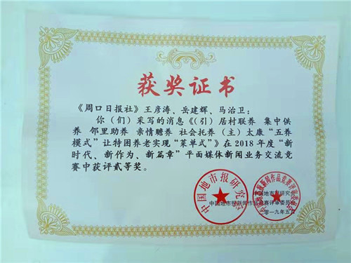 中國(guó)地市報(bào)新聞獎(jiǎng)評(píng)選活動(dòng)由中國(guó)地市報(bào)研究會(huì)主辦,每年舉辦一次,在全國(guó)有著廣泛的影響,此項(xiàng)新聞獎(jiǎng)評(píng)選活動(dòng)涉及全國(guó)幾乎所有地市黨報(bào),不僅是展示地市黨報(bào)形象的重要舞臺(tái),也是衡量地市黨報(bào)辦報(bào)水平的重要標(biāo)志,同時(shí)也是以新聞的形式展示各地亮點(diǎn)工作的重要?!短怠拔屦B(yǎng)模式”讓特困養(yǎng)老實(shí)現(xiàn)“菜單式”》稿件在此項(xiàng)新聞獎(jiǎng)評(píng)選中,同樣表現(xiàn)不凡,最終榮獲中國(guó)地市報(bào)新聞獎(jiǎng)二等獎(jiǎng)。