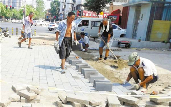 中州大道與文昌大道交叉口處,工人們在烈日下鋪設(shè)人行道地磚。