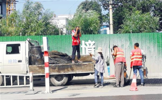 工農(nóng)南路,市政人員正在烈日下緊張地鋪設(shè)瀝青路面。