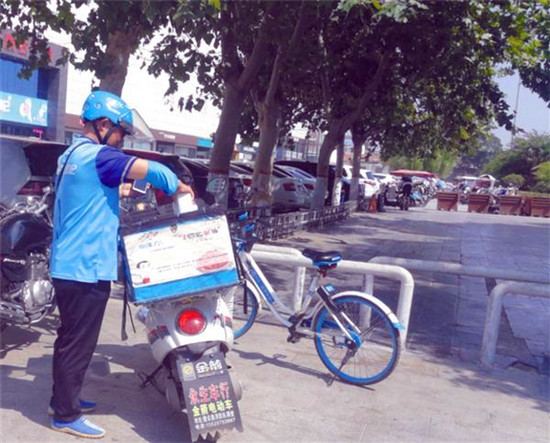 七一路五一文化廣場旁,一名外賣小哥接餐后準備出發(fā)。