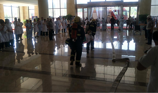 此次演練模擬一個蒙面歹徒在該縣六樓某科室打砸并故意縱火,轄區(qū)公安干警、消防指戰(zhàn)員及醫(yī)院保安力量迅速出動處置,防恐人員及時將犯罪分子制服,而此時醫(yī)院內(nèi)火災迅速蔓延,多名醫(yī)護人員被困火場無法逃生,醫(yī)院負責人通過應急廣播進行人員疏散,消防指戰(zhàn)員按照預定應急處置方案迅速展開滅火救援行動。