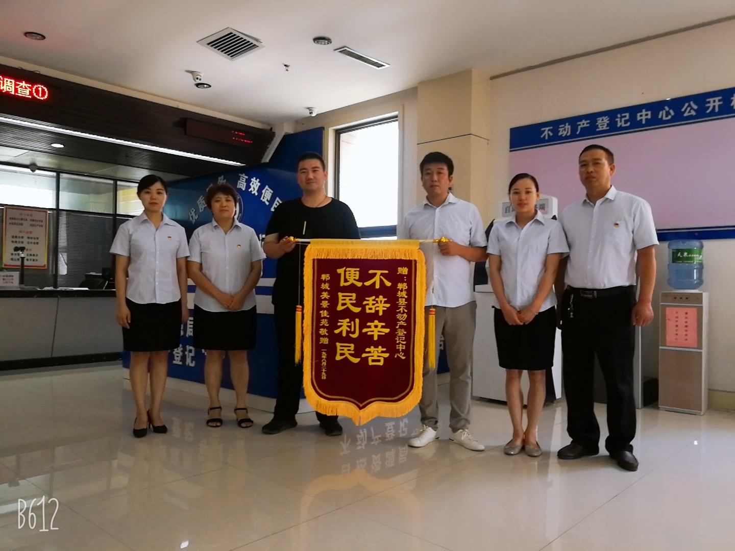 近日,河南博騏置業(yè)有限公司工作人員來(lái)到鄲城縣不動(dòng)產(chǎn)登記中心,將一面印有“不辭辛苦,便民利民”的錦旗送到了中心負(fù)責(zé)人手中,對(duì)不動(dòng)產(chǎn)登記中心真心為民的服務(wù)態(tài)度和高效的辦事效率表示感謝,點(diǎn)贊窗口“熱情、文明、高效”的服務(wù)。
