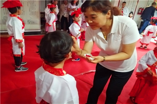 活動包含“朱砂開智”、誦讀《弟子規(guī)》、“擊鼓明志”、書畫展示、感恩五個環(huán)節(jié):第一個環(huán)節(jié)老師為孩子“朱砂開智”。用朱砂為剛剛?cè)雽W的孩子在額頭正中點上紅痣,又稱之為“開天眼”。寓意著孩子從此心明眼亮,好讀書、讀好書。第二個環(huán)節(jié)老師帶領(lǐng)大家誦讀《弟子規(guī)》。孩子們在老師及社區(qū)工作人員帶領(lǐng)下誦讀國學經(jīng)典《弟子規(guī)》,一起感受儒家經(jīng)典的道德教化魅力。第三個環(huán)節(jié)是“擊鼓明志”。擊鼓明志是結(jié)合中國傳統(tǒng)文化,讓孩子們通過擊打中國鼓,以鼓聲的清脆悅耳,來提高孩子的精氣神,激發(fā)孩子們的斗志,給孩子們建立濟世救人,胸懷天下的抱負,從而也讓孩子們表達出人生理想,為未來的人生目標努力奮斗?!拔议L大想當一名醫(yī)生,可以治病救人……我長大想當一名消防員,在著火的時候奔赴火場救人……我長大想當一名古箏老師,登上世界舞臺彈奏好聽的音樂……”孩子們依次擊鼓并說出了人生理想抱負。第四個環(huán)節(jié)是書畫展示。繪畫創(chuàng)作讓孩子們靜定心靈,激發(fā)智慧。第五個環(huán)節(jié)是感恩環(huán)節(jié),感恩老師、感恩父母、感恩天地萬物,以此培養(yǎng)孩子們向善向上的健康思想,增強他們的社會責任感,進一步引導他們常懷感恩之心。