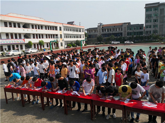 7月2日,沼山中學(xué)師生齊聚學(xué)校操場(chǎng),舉行“小手拉大手 同創(chuàng)文明城”活動(dòng)啟動(dòng)儀式。活動(dòng)現(xiàn)場(chǎng),同學(xué)們整齊列隊(duì),依次上前,鄭重地在橫幅上簽上自己的名字,吹響學(xué)校新一輪創(chuàng)建攻堅(jiān)號(hào)角。