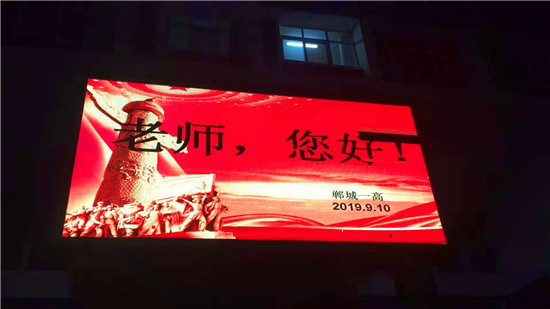 “老師,您好!”9 月10日晚上,鄲城縣人民公園大屏幕上,向全縣教師發(fā)出了溫暖、明亮的祝福。同一時(shí)刻,城區(qū)各主要街道公共LED大屏幕,以及縣一高、三實(shí)小等城區(qū)學(xué)校和石槽一中、秋渠一中等鄉(xiāng)村學(xué)校的顯示屏上,“老師,您好”四個(gè)大字在夜幕下顯得格外的醒目與亮眼。教師節(jié)當(dāng)夜,老師儼然成為了“夜空中最閃亮的星”。